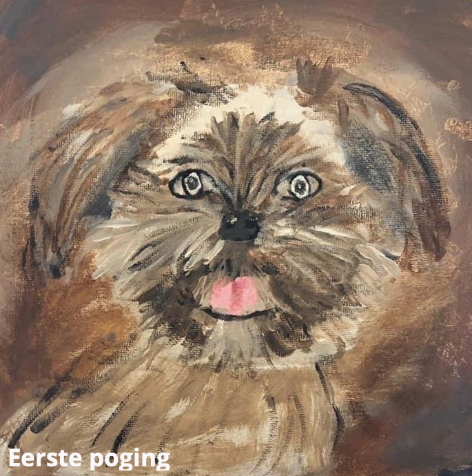 Toen ik Ineke voor het eerst wat beter leerde kennen waren we op de vakantieweek van het Meester Geertshuis. Ik zag meteen dat ze talent had voor tekenen, zelf zag ze dat nog niet. Ze wilde heel graag dat ik haar hondjes zou schilderen. Ik zei: 'als je bij mij op les komt dan kun je het zelf', maar eerst zag ze dat helemaal niet zitten. Toen heb ik als verrassing Jenny voor haar geschilderd, dit hondje was pas overleden. Ze was heel blij met het schilderij en ze wilde dat ik ook het andere hondje, Kiki, zou schilderen. Dat deed ik natuurlijk niet, haha!